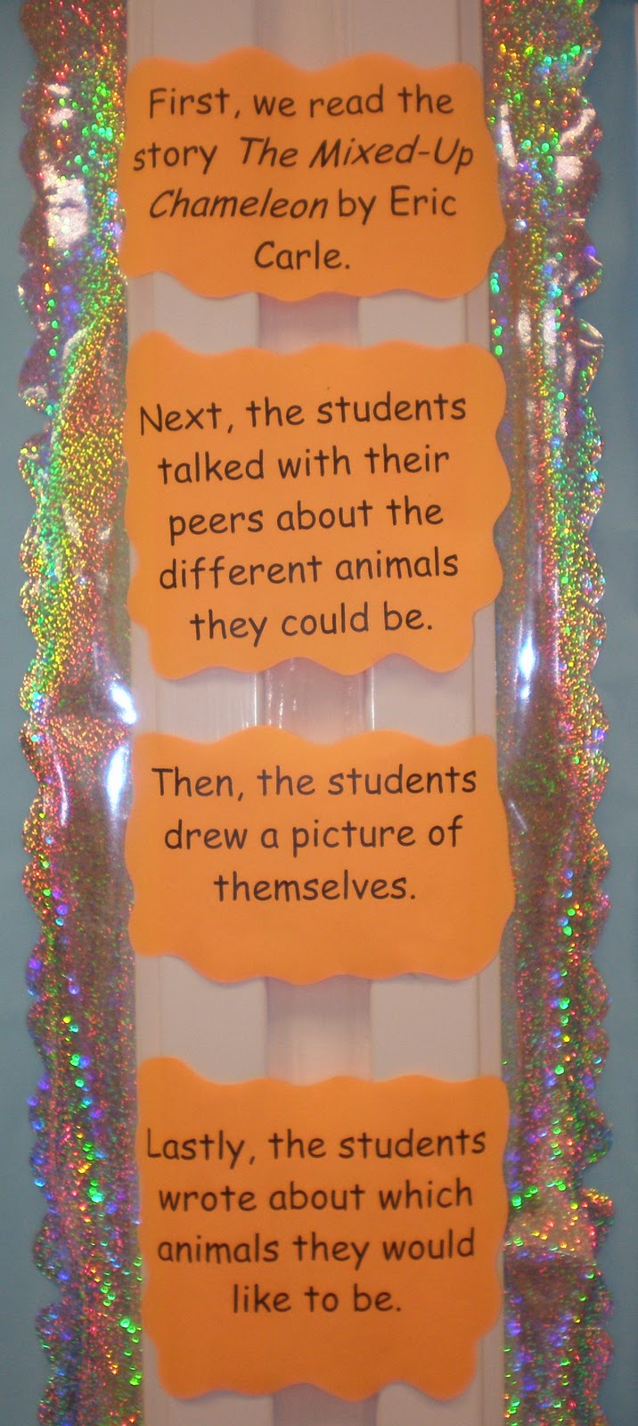 Here is an explanation of an assignment their students worked on where the work is up on one of the bulletin boards. This is another way we can model the strategy, to help students see the connection between what they are doing and applying it to a different context.